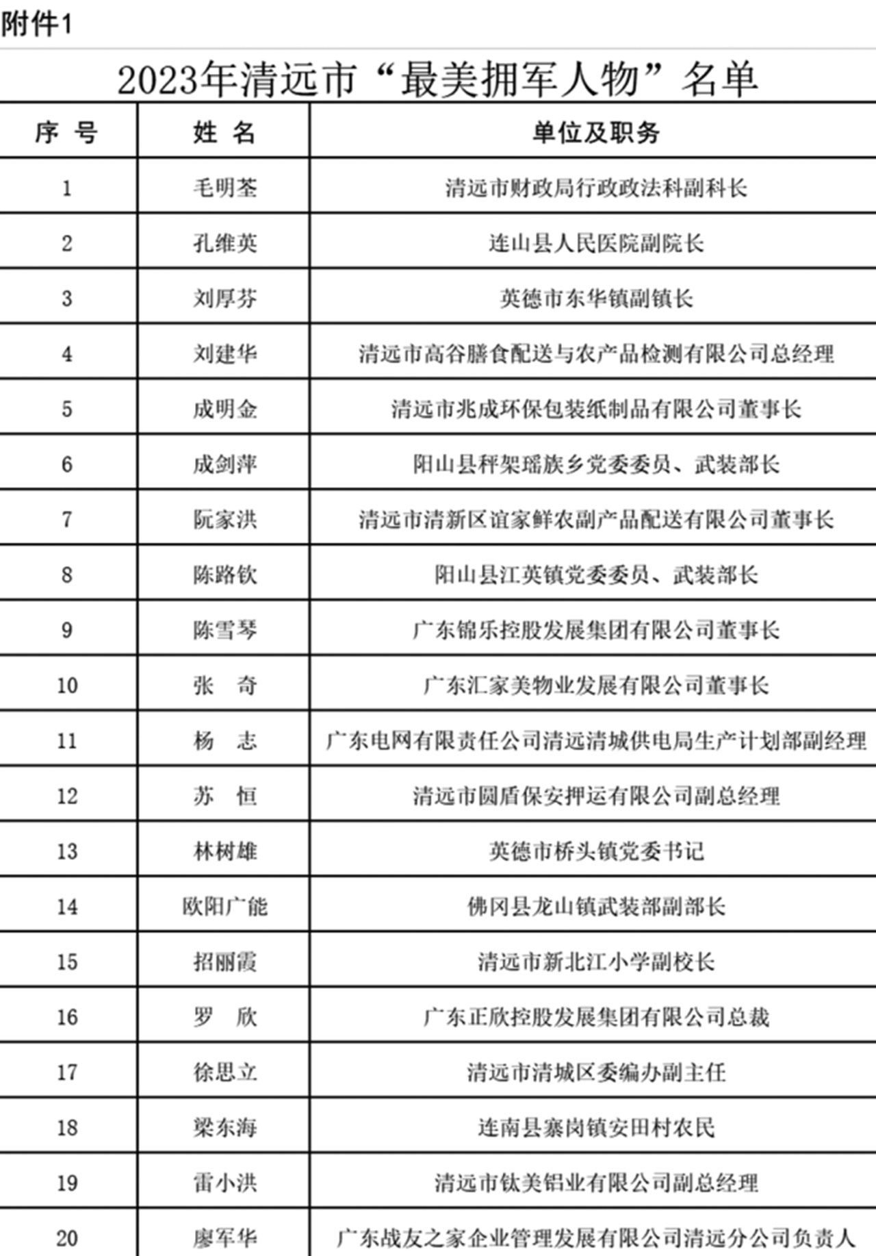 為激勵(lì)廣大干部群眾學(xué)習(xí)最美、爭當(dāng)最美,在全社會(huì)大力營造關(guān)心國防、尊崇軍人濃厚氛圍,營造立足崗位作貢獻(xiàn)、建功立業(yè)新時(shí)代的時(shí)代風(fēng)尚,清遠(yuǎn)市雙擁工作領(lǐng)導(dǎo)小組對(duì)毛明荃等20名“最美擁軍人物”、齊秀娟等10名“最美軍嫂”予以通報(bào)表揚(yáng)。